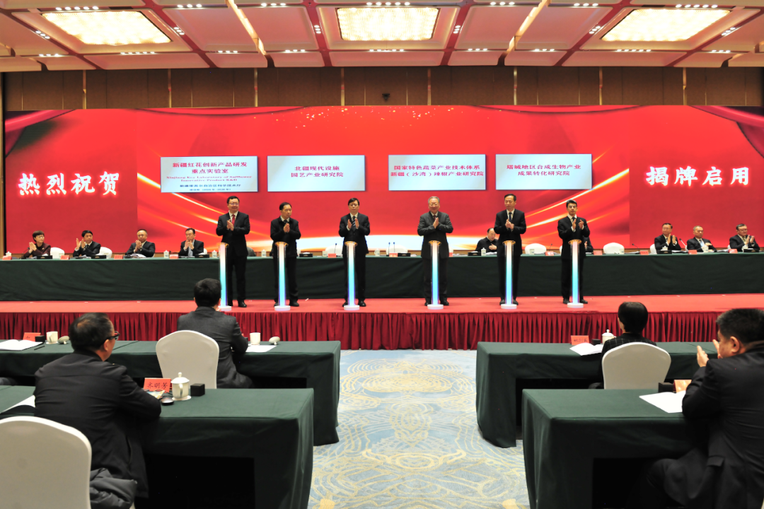 随后,支现伟、阿依丁·托留汗和有关院士专家共同为新疆红花创新产品研发重点实验室、北疆现代设施园艺产业研究院、国家特色蔬菜产业技术体系新疆(沙湾)辣椒产业研究院等12家研究机构揭牌。
