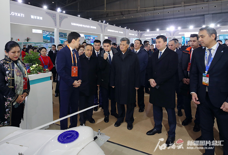 开幕式前,自治区党委书记马兴瑞,乌兹别克斯坦副总理霍扎耶夫,自治区党委副书记、自治区主席艾尔肯·吐尼亚孜与部分中外嘉宾共同进行巡展。天山网-新疆日报记者 谢龙摄