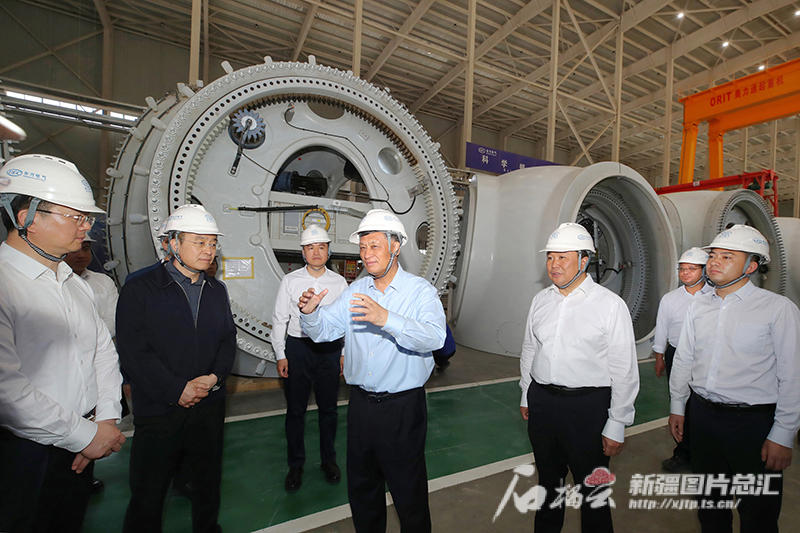 5月19日,自治区党委书记马兴瑞来到昌吉回族自治州木垒哈萨克自治县,深入重点风电装备制造企业调研。这是马兴瑞走进新疆东方风电新能源有限公司生产车间,详细了解风机等设备生产制造情况。天山网-新疆日报记者 崔志坚摄