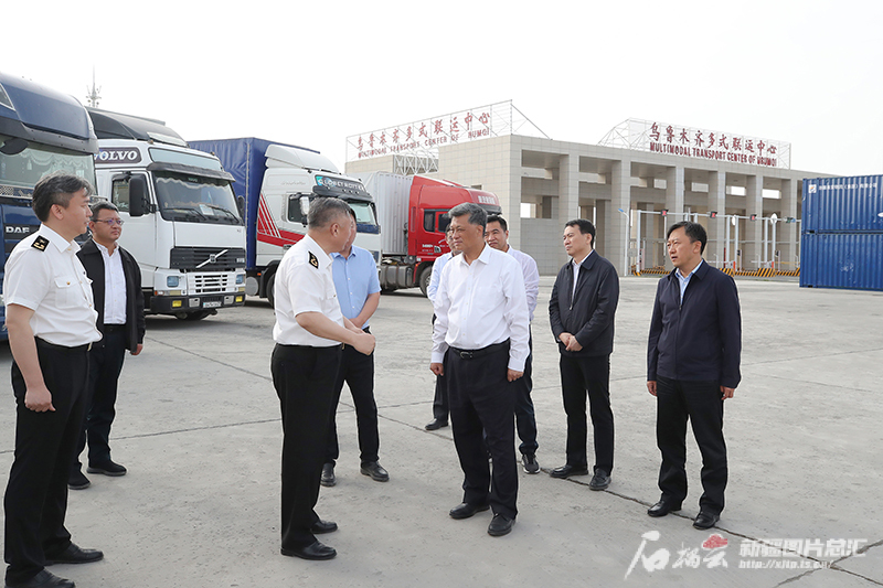 5月17日,自治区党委书记马兴瑞在乌鲁木齐国际陆港区多式联运中心集装箱堆场,同海关、商务部门和新疆商贸物流集团负责同志交流。天山网-新疆日报记者 崔志坚摄