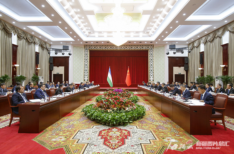 6月25日,自治区党委书记马兴瑞、自治区主席艾尔肯·吐尼亚孜,在乌鲁木齐市会见来新疆出席第八届中国—亚欧博览会的乌兹别克斯坦总理阿里波夫一行。天山网-新疆日报记者 谢龙 摄