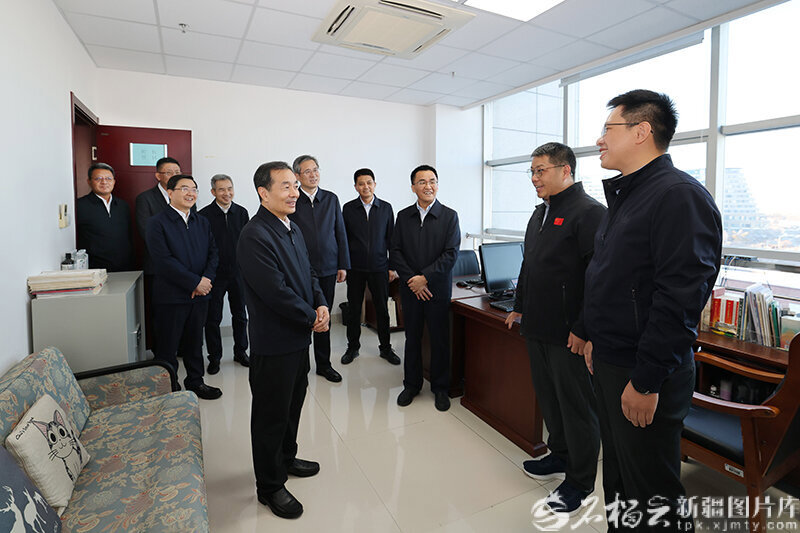 11月7日,自治区党委书记、兵团党委第一书记、第一政委陈小江在新华社新疆分社,了解新闻信息产品,看望慰问一线采编人员。石榴云/新疆日报记者 崔志坚摄
