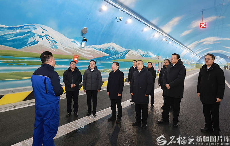 12月26日,自治区党委书记陈小江、自治区主席艾尔肯·吐尼亚孜在G0711乌尉高速天山胜利隧道,调研工程建设运营工作,代表自治区党委和政府向公路建成通车表示热烈祝贺。石榴云/新疆日报记者 崔志坚 摄