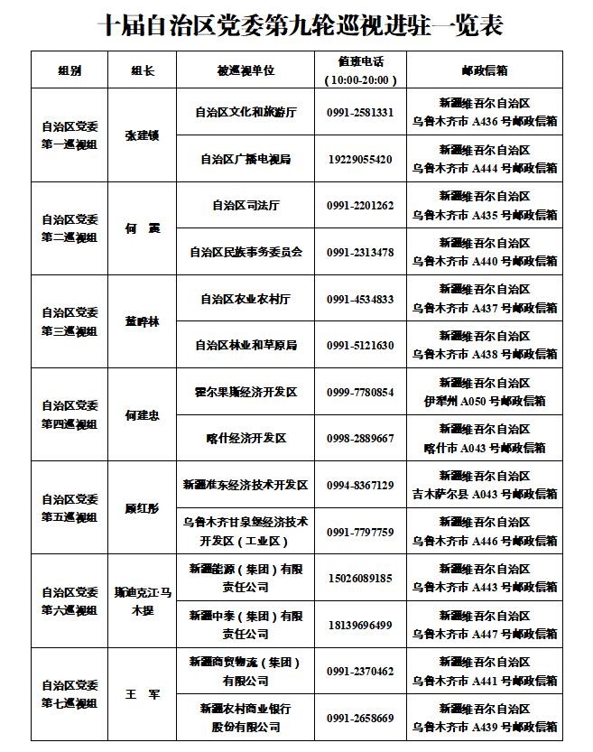 天山网-新疆日报讯 根据自治区党委关于巡视工作的统一部署,截至4月3日,十届自治区党委第九轮巡视完成进驻工作。7个巡视组将对自治区文化和旅游厅等6家区直部门(单位),霍尔果斯经济开发区等4个开发区,新疆能源(集团)有限责任公司等4家区属国有企业开展巡视“回头看”。