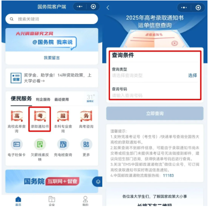 查录取通知书物流信息,可以在微信小程序搜索“国务院客户端”,输入快递单号/准考证号(考生号),手动查询物流信息。