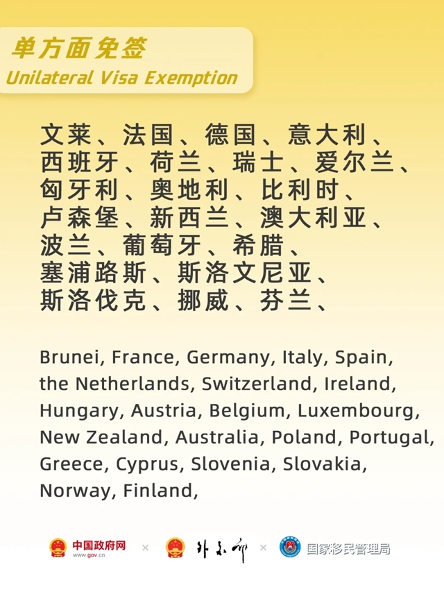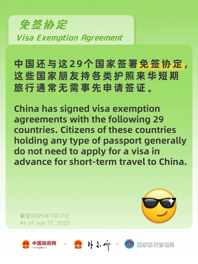 哪些国家能免签来中国?最全列表! 来源:中国政府网 发布时间:2025-08-05 09:41:00 浏览次数: 次 字体:小 大 打印 分享到: 这是咱家!快转给你的外国朋友属于中国的色彩美学等待领略Welcome to China!哪些国家能免签来中国?最全列表,一起看↓ 扫一扫在手机打开当前页