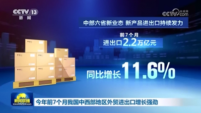 今年前7个月我国中西部地区外贸进出口增长强劲 来源:央视网 发布时间:2025-08-21 21:43:00 浏览次数: 次 字体:小 大 打印 分享到: 今年以来,我国中西部地区货物贸易进出口增速领跑全国。中部六省新业态、新产品进出口持续发力。前7个月进出口2.2万亿元,同比增长11.6%,规模创历史同期新高。西部十二省(区、市)外贸进出口均保持增长,前7个月进出口2.5万亿元,同比增长10.5%。其中,四川继续保持西部地区首位,占西部外贸的比重达24.3%;青海、新疆增幅较大,分别增长49.3%、27.3%。 扫一扫在手机打开当前页
