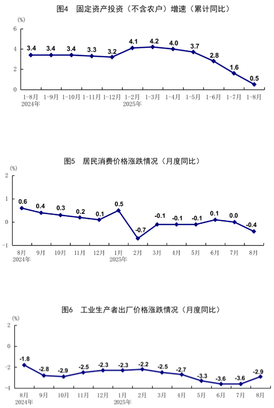8月份,全国工业生产者出厂价格同比下降2.9%,降幅比上月收窄0.7个百分点,环比持平;全国工业生产者购进价格同比下降4.0%,降幅收窄0.5个百分点,环比持平。1—8月份,全国工业生产者出厂价格和购进价格同比分别下降2.9%、3.3%。