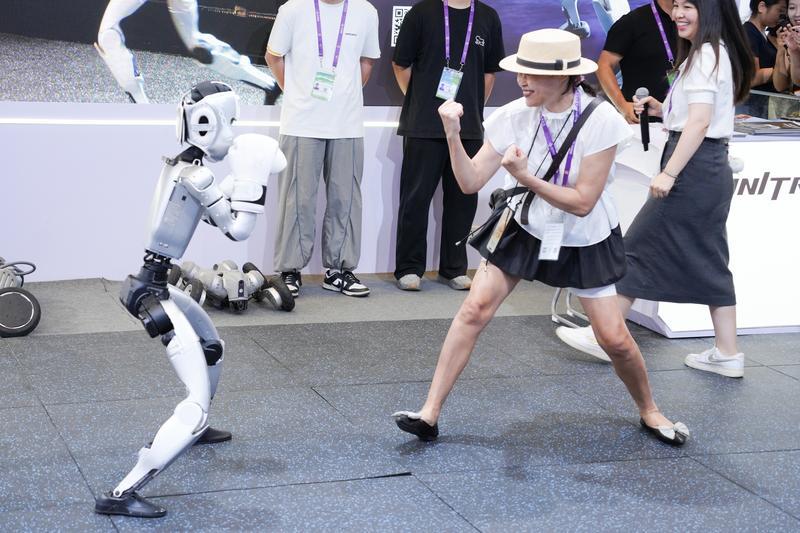 2025年9月19日,在广西南宁国际会展中心人工智能专馆,一台人形机器人和观众表演拳击。新华社记者 周汀鹭 摄