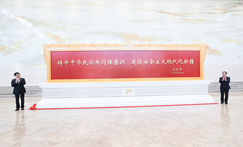 贺匾蔚为大观,习近平总书记“铸牢中华民族共同体意识 建设社会主义现代化新疆”的题词寓意高远,中华同心尊庄重典雅,体现了党中央对新疆的深切关怀和殷切期望。仪式上,王沪宁和新疆维吾尔自治区党委书记陈小江,一同为贺匾和中华同心尊揭幕。
