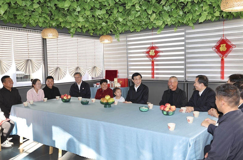 9月26日,受习近平总书记嘱托,中共中央政治局常委、全国政协主席、中央代表团团长王沪宁带领中央代表团部分成员到新疆生产建设兵团第二师铁门关市、第十师北屯市考察。这是王沪宁和中央代表团部分成员在兵团第十师北屯市同职工群众交流。新华社记者 姚大伟 摄