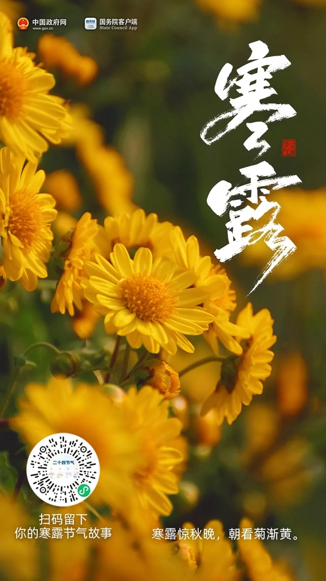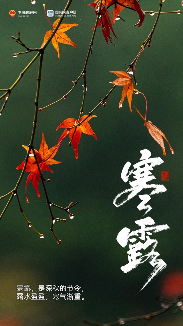 今天8:41,进入第一个带“寒”的节气 来源:中国政府网 发布时间:2025-10-08 09:13:00 浏览次数: 次 字体:小 大 打印 分享到: 今天8点41分,我们迎来寒露节气。寒露是二十四节气中最早出现“寒”字的节气,标志着深秋已至。 扫一扫在手机打开当前页