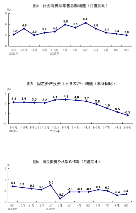 (2)根据季节调整模型自动修正结果,对近一年来各期国内生产总值、规模以上工业增加值、固定资产投资(不含农户)、社会消费品零售总额环比增速进行修订。修订结果及2025年三季度GDP环比数据、2025年9月份其他指标环比数据如下: