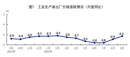 前三季度,全国工业生产者出厂价格同比下降2.8%。其中,9月份同比下降2.3%,降幅比上月收窄0.6个百分点,环比持平。前三季度,工业生产者购进价格同比下降3.2%。其中,9月份同比下降3.1%,降幅比上月收窄0.9个百分点,环比上涨0.1%。