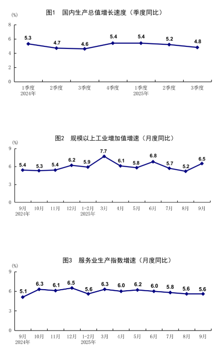 2024年各季度及2025年一季度、二季度、三季度GDP环比增速分别为1.3%、1.0%、1.5%、1.5%、1.2%、1.0%和1.1%。