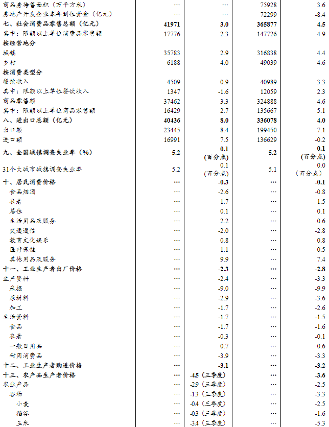 前三季度,全国固定资产投资(不含农户)371535亿元,同比下降0.5%;扣除房地产开发投资,全国固定资产投资增长3.0%。分领域看,基础设施投资同比增长1.1%,制造业投资增长4.0%,房地产开发投资下降13.9%。全国新建商品房销售面积65835万平方米,同比下降5.5%;新建商品房销售额63040亿元,下降7.9%。分产业看,第一产业投资同比增长4.6%,第二产业投资增长6.3%,第三产业投资下降4.3%。民间投资同比下降3.1%;扣除房地产开发投资,民间投资增长2.1%。高技术产业中,信息服务业,航空、航天器及设备制造业,计算机及办公设备制造业投资同比分别增长33.1%、20.6%、7.4%。9月份,固定资产投资(不含农户)环比下降0.07%。