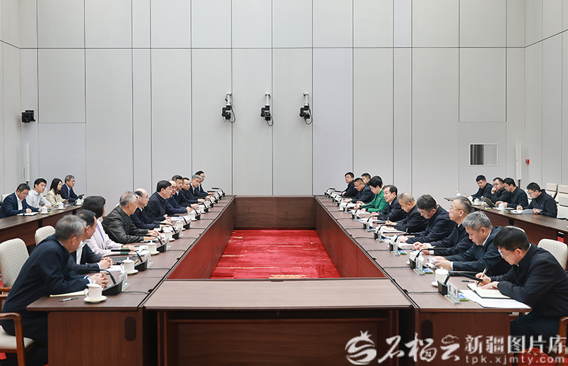 3月21日,自治区党委书记陈小江、自治区主席艾尔肯·吐尼亚孜在中国石油天然气集团有限公司与中国石油董事长戴厚良、总经理周心怀交流座谈。天山网-新疆日报记者 崔志坚 摄